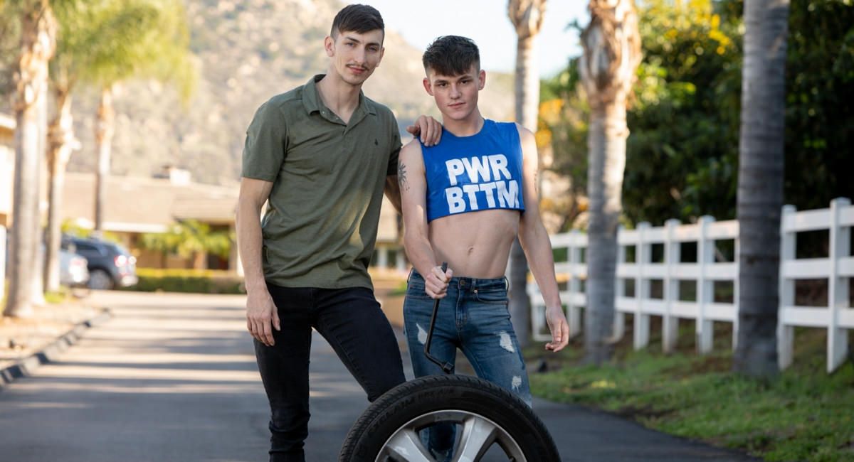 Alluring Avery Jones just CANNOT change a tire if his life depends on it. While fumbling around with a... a... wait, what's that tool called? Sexy savior Michael Jackman insists on cumming to his rescue. He calls a mechanic and these two twinks ditch the car tools for a little manual tune up of their own. Enjoy!